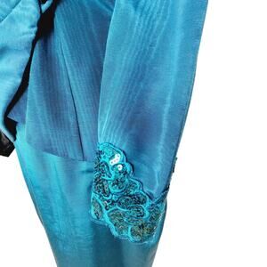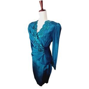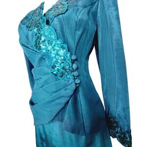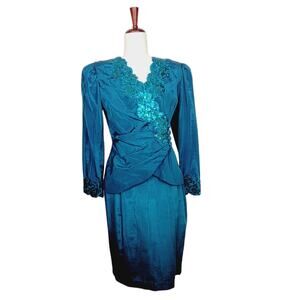 VINTAGE Scott McClintock Petites 80s Teal Taffeta Embellished Blazer & Skirt 8