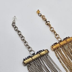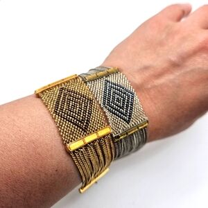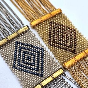 Vintage unique bracelet set of two. Includes two bracelets made of seed beads and metal chain. One silver-tone and one gold-tone. Adjustable lobster clasp close. Measures about 6.5" - 8" long. Purchased from an estate and no visible maker's mark. Excellent condition and smoke-free home.