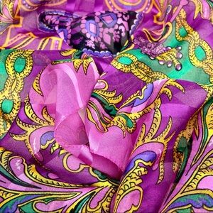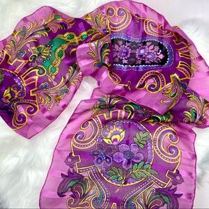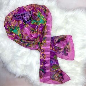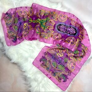 VINTAGE Sheer Striped Floral Gem Tones Orchid Purple Emerald Green Gold Scarf