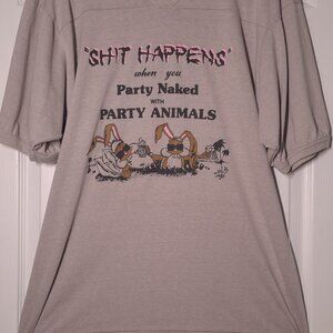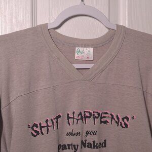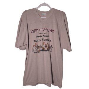 VINTAGE Sh*t Happens When You Party Naked USED V-Neck Shirt (XL, Tan, Humor)