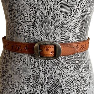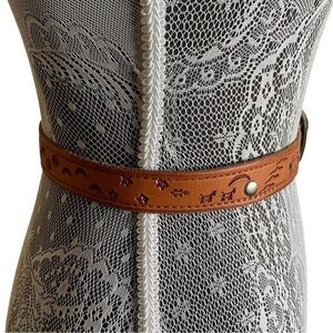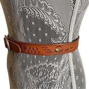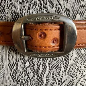 Vintage Signed Al Stohlman Hand Tooled Spell Out Leather “Mabel” Belt. Features an oval silver buckle that has an etched design on both the upper & lower portion of the buckle. Buckle is signed on the back. Beautiful hand tooled design throughout the expanse of the belt including stars, moons, animals, etc. including “Mabel.” Such detail! In very good preloved condition with minimal normal wear consistent with vintage age. No size listed so please check the following approximate measurements carefully prior to purchasing: 30.5” from buckle end to end & 1” wide. Buckle measures approximately 2.25” X 1.5.” Bundle to maximize shipping!