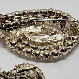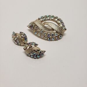 Vintage Signed Coro Brooch and Earrings Set Opalescent Rhinestones Gold Tone