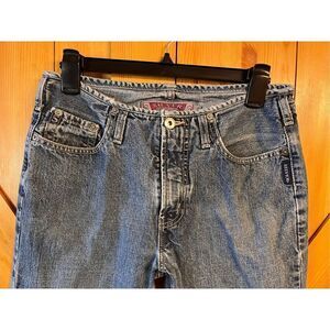 VINTAGE Silver FLARE Jeans Size 30 Blue Made in Canada has wear/distressed on bottoms/waist see pictures measurements 28” waist 29.5” inseam 9” rise (3001)