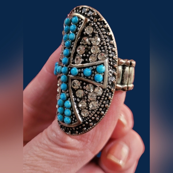 VINTAGE Silver, Pewter & Turquoise Cross Ring W/Stretchable Band