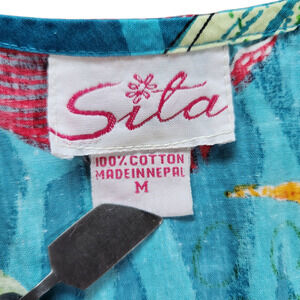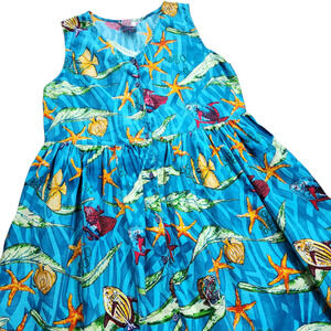 VINTAGE Sita dress is sleeveless and button-front. Ocean / tropical fish pattern, size medium, v-neck, full skirt. There is one small blemish near the neckline, as shown in last photo; otherwise great pre-owned condition.