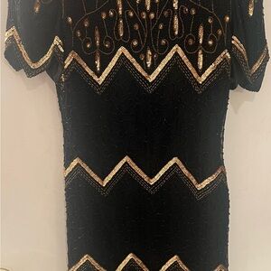 VINTAGE Size M LAWRENCE KAZAR black gold sequin cocktail dress with slit