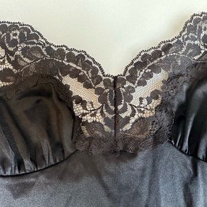 Chunks of delicate lace line the top of the bust. Has the function of a slip underneath a dress while decorative enough to stand on its own as lingerie.