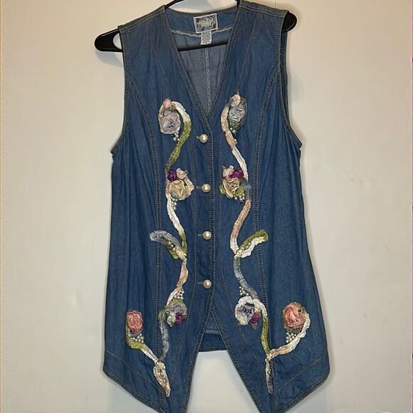 VINTAGE Soft Blue Jean Vest, Floral, Pearl Buttons