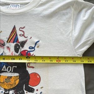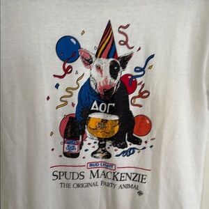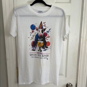 Celebrate in style with the Spuds Mackenzie graphic tee. This white shirt offers a fun and casual look, perfect for any occasion. Excellent condition