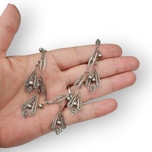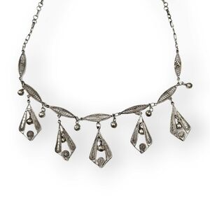 Intricate sterling filigree necklace made with Turkish style panels in the shape of leaves and five dangling flower shaped filigree panels accented with round balls