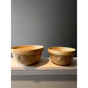 A beautiful set of two vintage stoneware mixing bowls featuring a raised fruit and grapevine design around the body. These bowls are in excellent vintage condition with no chips or cracks and light age-appropriate crazing. Their warm tan glaze and embossed fruit motif make them the perfect fit for any kitchen décor — from farmhouse and rustic to cozy modern.