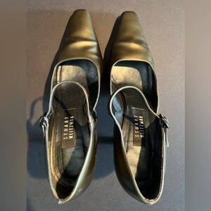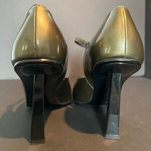 Beautiful used vintage Stuart Weitzman heels! Green patent leather (in some lights it looks like it has a hint of gold). Heel is located in the center of the foot’s heel, which makes them easier to walk in. 4 inch heel with adjustable strap. Made in Spain. Size 10.