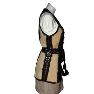 VINTAGE Suede Vest Patchwork Crochet Knit Button Front Tie Belt Size Medium