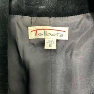 Women’s Vintage Talbots holiday blazer with velvet collar and gold thread. There are a few snags on the back right shoulder, please see the last photo. Otherwise great condition. Size 6