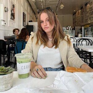 Very indie, light academia vibes, could be styled with a mini dress or jeans! It could fit be an oversized small or a medium-large! Let me know if you have any questions.