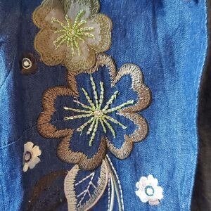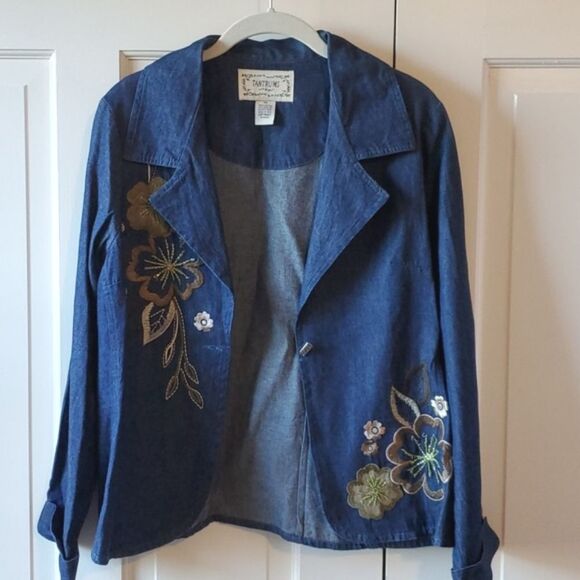 VINTAGE TANTRUM EMBROIDERED DENIM JEAN BLAZER JACKET FLORAL BOHO SZ PM
