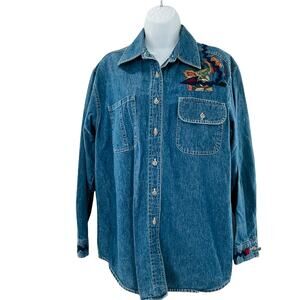 VINTAGE TAPE MEASURE Blue Denim Applique Button Up Jean Shirt Jacket