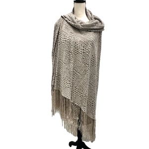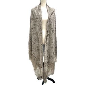 Vintage taupe/tan burnout velvet and silk fringe scarf wrap. The manufacturer and materials tag was removed. There are different patterns all over the scarf. The fringe is hand knotted and is about 10" long. In excellent preowned condition.
