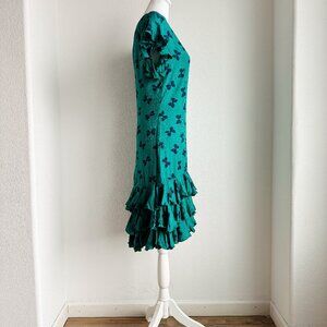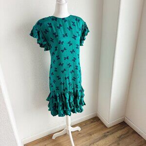 Teal green silk dress with navy bow print and ruffle sleeves and ruffle hem