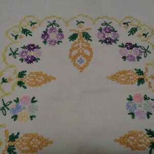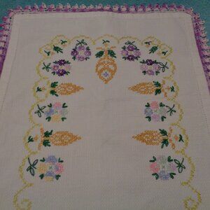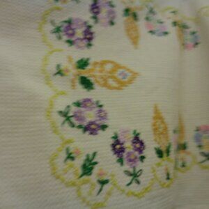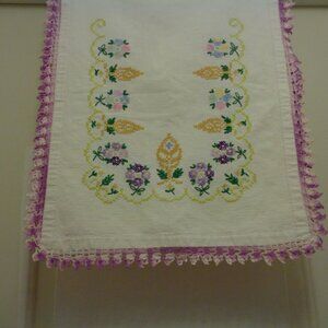 VINTAGE TEXTURED COTTON HAND EMBROIDERED HAND CROCHETED 1950S RUNNER. THIS IS SUCH A PRETTY PIECE. IT IS VERY WELL DONE. IT IS WHITE WITH THE COLORS EMBROIDERED ON IT. IT WAS DONE IN THE 1950S. SIZE WISE IT IS 36 INCHES LONG AND 15 INCHES WIDE. WITH SOME WEAR YET PLENTY TO SHARE WITH YOU LUCKY BUYER. VINTAGE TEXTURED COTTON HAND EMBROIDERED HAND CROCHETED RUNNER. 4TH GROUP # 77. THANKS