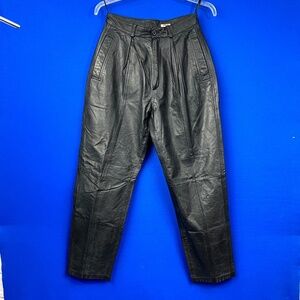 Excellent, amazing condition, vintage leather pants. So totally that vintage 80-90s cut! With a suuuper high waist, pleated front, and tapered cut leg. Embroidered 'Harley-Davidson' and eagle on the back. Zip and button enclosure & belts loops. Side pockets. Finished hems. Lined. Size '12.' If you know vintage sizing, you know they ran a lot smaller back then! So do be sure to note--> Approximate measurements in inches when laid flat: waist 13.5 across, inseam/length 29.5, front rise 13.5, hips 24 across, knees 10.5 across, bottom hem/leg openings 7.5 across. So that's a '27' waist, but also very HIGH compared to most jeans these days, so they sit that much higher where we're generally smaller but plenty roomy in the hips! So I'm listing this ONE PAIR as a number of sizes, that might want a shot at these dependent upon how you like your fit. SHELL: GENUINE LEATHER. LINING: 50% ACETATE, 50% NYLON. CAT. NO: 15-7612.