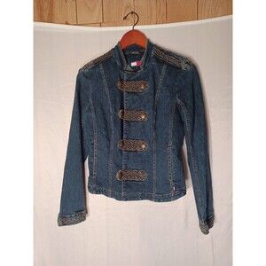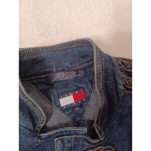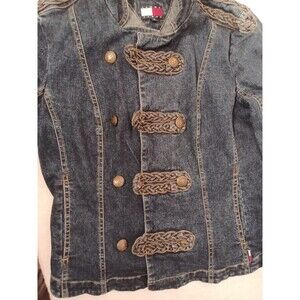 Excellent condition Vintage Tommy jeans military jacket 98 % cotton 2 % spandex. Fitted, nehru collar. braided accents bronze bottoms size M. Tommy logo in buttons