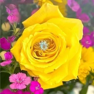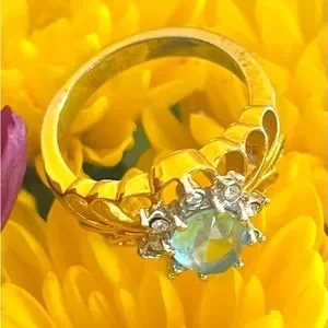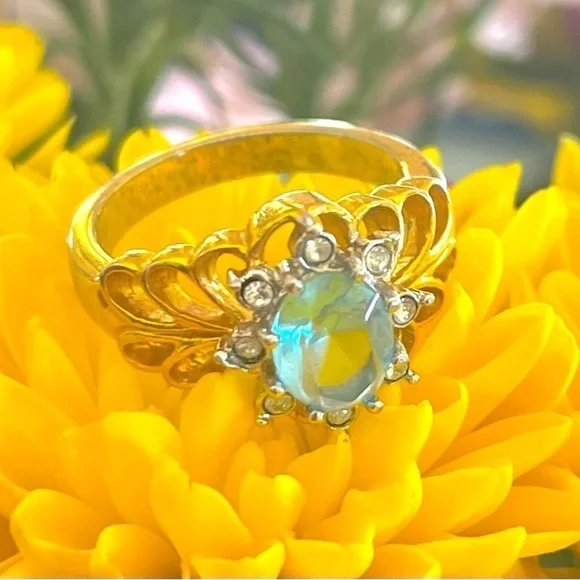 This ring is a real attention getter! Beautiful gold ring with layering and a large light blue oval shaped rhinestone topaz is surrounded by a small halo of white rhinestones.
