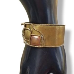 Unique vintage brutalist style cuff bracelet made by an artisan. Bracelet is tri color with the bracelet being made mostly of brass and accented with copper and sterling silver. Bracelet measures 6 inches around inside from one end of cuff to the other and 1-1/8 inches tall. Unique piece, good condition.