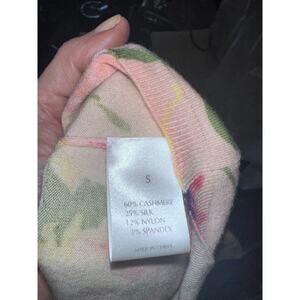 LIGHTWEIGHT SUPER SOFT CASHMERE SILK BLEND SWEATER FROM TSE. SPRING COLORS, BEAUTIFUL SCOOP NECKLINE, SILKY FEEL. SIZE SMALL, CHEST MEASURES 16" ACROSS UNSTRETCHED. EXCELLENT CONDITION. COLOR IS THE SOFTEST BALLET PINK WITH LILAC, PURPLE, GREEN AND YELLOW FLORAL PRINT.