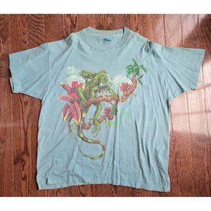 VINTAGE T-Shirt Green 1993 Single Stitch Ken Drewke Iguana Tee Harlequin Nature.
