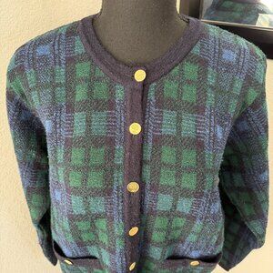 VINTAGE Talbots Tartan Plaid Blue Green Cardigan Sweater Medium