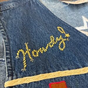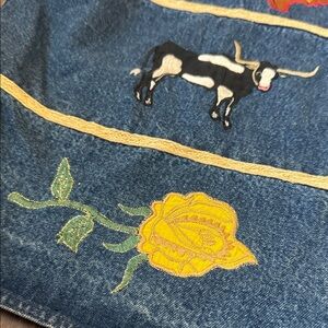 Stylish denim vest featuring Texas-themed embroidery. Includes designs of a cowboy boot, armadillo, and Texas flag. Perfect for adding a unique touch to your outfit.