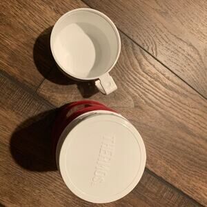 Red Thermos with White lid & cup, folding spoon inside Thermo twist on lid with extra compartment room.