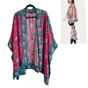 Vibrant floral kimono cardigan with pink and teal colors. Perfect for layering.