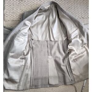 This vintage blazer is a classic addition to any wardrobe. With a gray herringbone pattern and single-breasted cut, it features a notch lapel and three-button sleeve button style. The jacket has a flat front and single vent, with a two-button front button style.