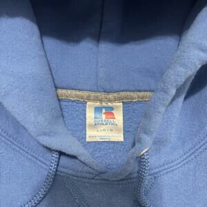 The Vintage UCLA Bruins Softball Russell Athletic Sweatshirt is a classic blue hoodie in size L, perfect for any fan of the UCLA Bruins. Made by Russell Athletic, this pullover hoodie features the team's logo and is ideal for both casual wear and showing support at games. The regular fit and comfortable design make it a great addition to any activewear collection.