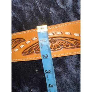 VINTAGE UNWORN CALDWELL TOOLED LEATHER BELT WITH BEADED BUCKLE. MEASUREMENTS IN PHOTOS. BUCKLE IS REMOVABLE WITH SNAPS.