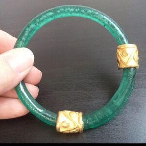 This is a stunning vintage estate unsigned Fedra Couture bangle bracelet, measuring approximately 7.5 inches in circumference. The piece features a sleek, translucent green band, likely crafted from high-quality resin or a similar material, exuding a jade-like appearance. The design is elegantly accented by two bold gold-tone end caps, detailed with intricate embossed patterns that enhance the luxurious feel of the bracelet. This timeless accessory is versatile, making it a perfect statement piece for both casual and formal ensembles. Its exquisite craftsmanship and classic appeal reflect the hallmark sophistication of vintage couture jewelry.