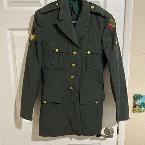 Step back in time with this authentic VINTAGE US ARMY M51 Dress Jacket, dating back to the Korean War era of 1952. This rare collectible piece comes in a size small, specifically Size 35L, perfectly tailored for a classic and timeless fit. The jacket is crafted from durable, high-quality materials typical of military garments of the era, ensuring both longevity and a unique historical aesthetic.\n\nThe deep olive color embodies the traditional US Army hues, complemented by original, ornate gold buttons that add a touch of elegance. Two chest pockets provide practicality and style, while the added vintage patches on the sleeve highlight its authentic military history. This jacket is not only an exceptional piece for collectors but also a versatile fashion statement for those interested in military fashion. \n\nCondition: Well-preserved with visible patches showing signs of its storied past.