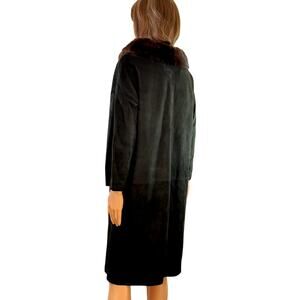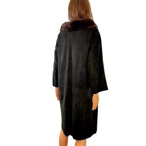 This VINTAGE PRE-OWNED genuine lambskin suede coat is stunning. The color is dark hunter green which is nearly black, with a brown genuine luscious mink collar that can be worn up around the face or down for a sweet romantic look. Satin lined. Looks very romantic and very boho chic. No size tag, but fits like a size M. Please see below measurements to ensure a proper fit. Retail value $1,200.