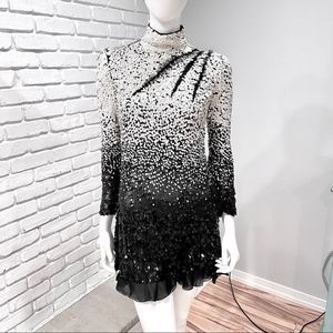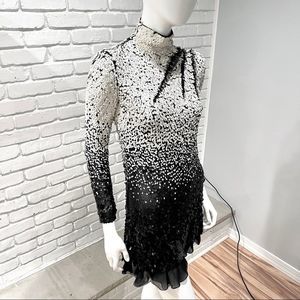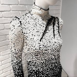 Vintage Valentino Long Sleeve Oval White to Black Ombre Sequin High Mock Turtleneck Neck Dress with Silk Trim