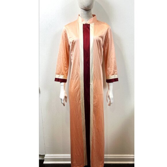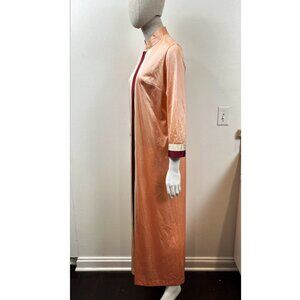 1960'S VINTAGE VANITY FAIR PEACH MUMU ROBE IN A MARKED SIZE 12- FITS A MEDIUM. HALF ZIP FRONT. 3/4 SLEEVES. GORGEOUS PEACH COLORING WITH A STRIPED ACCENT DOWN THE FRONT.