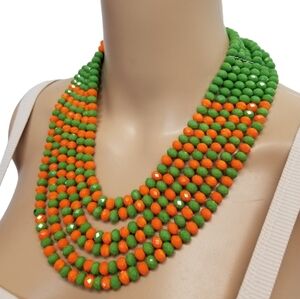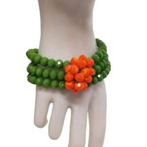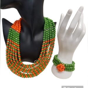 Vintage high quality necklace and matching bracelet set made with vibrant green and orange faceted glass beads in a beautiful pattern. Necklace is a true statement piece with its many layers that lay out in a bib style design. Necklace measures 19 inches in length. Bracelet is matching and has a green glass bead band with several strands making up the band with a cluster flower of orange beads accenting the top of bracelet. Bracelet measures 8-1/2 inches total length. Both necklace and bracelet have silvertoned hardware with fold over clasp closures. Set is in excellent condition
