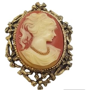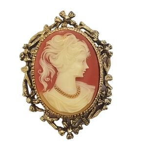 Beautifully detailed Victorian revival style cameo brooch/ pendant. This piece has a lovely cream colored portrait of a girl with a soft orange background. This cameo is unique in that the girl is wearing a small goldtoned chain necklace. Cameo is set in a goldtoned ornately detailed frame. Piece measures 2-1/2 inches tall and 1-3/4 inches wide. Can be worn as brooch or on necklace as it has a bale on back. Excellent condition.