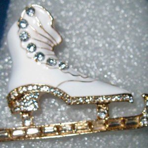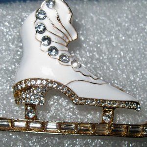 "VINTAGE VICTORIAN-LOOK FANCY ICE SKATE BEAUTIFULLY DETAILED WITH SPARKLING RHINESTONES AND WHITE HAND APPLIED ENAMEL"...this Victorian looking ice skate from years gone by is Fabulous! The gold tone detailing is gorgeous as are the rhinestones that sparkle with any movement. It is unsigned but I'd like to give a yahoo to the designer! The deluxe gold tone finish is awesome and the hand applied white epoxy takes my breath away.It measures -1/8" across by 1-3/4" and has a gold plated clasp on the back. We think it is Beautiful and imagine how awesome it will look on your winter coat! It will ship to the buyer by the following business day in a Free gift box (while supplies last).