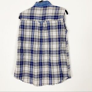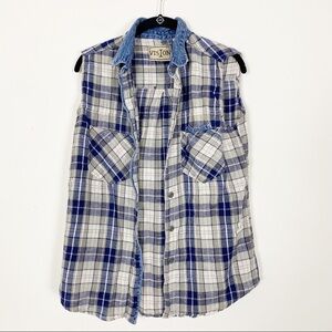 VINTAGE VISION Blue Gray Plaid Knit Jean Collar Button Shirt Vest Large Grunge