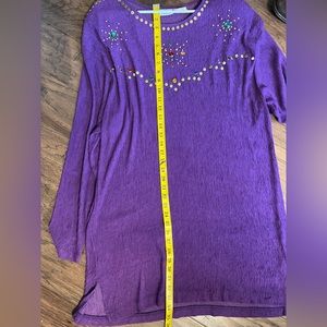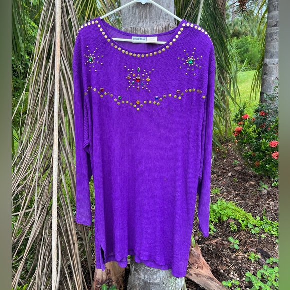 VINTAGE VTG Bonnie Blair Fashions Purple Gemstone Boho Bohemian Festival Mini Midi Dress Women's XL with built in shoulder pads. This is the perfect dress as we transition into fall for all of those holiday parties. This would even make the perfect LSU game day dress or think Mardi Gras! The size tag is discolored but the overall condition of the dress is great. See photos for measurements!