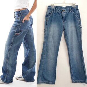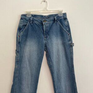 ◇ Juniors size 9. Approx medium wash (or lighter medium wash / light wash). Intentionally faded whiskered distressed. Red stitching accents. Tommy Hilfiger flag logo detail on hammer loop. Seven pockets total - standard five pocket, plus two smaller pockets on one side of jeans. Zipper zip fly. Wide leg and/or baggy leg. Carpenter jeans carpenter jean (sometimes also called painters jeans painters jean)