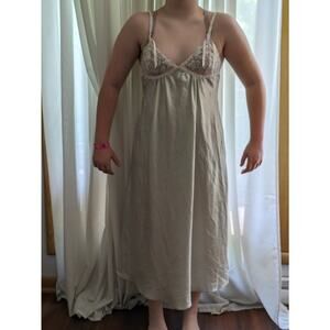 Fits a medium. No size tags. The brand tag is only attached on one side and had writing on it. There are a few loose threads throughout the lace and snags throughout the silk. I've attempted to photograph all flaws.