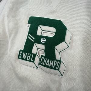 Vintage varsity letterman pullover sweater featuring a large chenille block "R" with baseball detail and "SWBL CHAMPS" across the front.